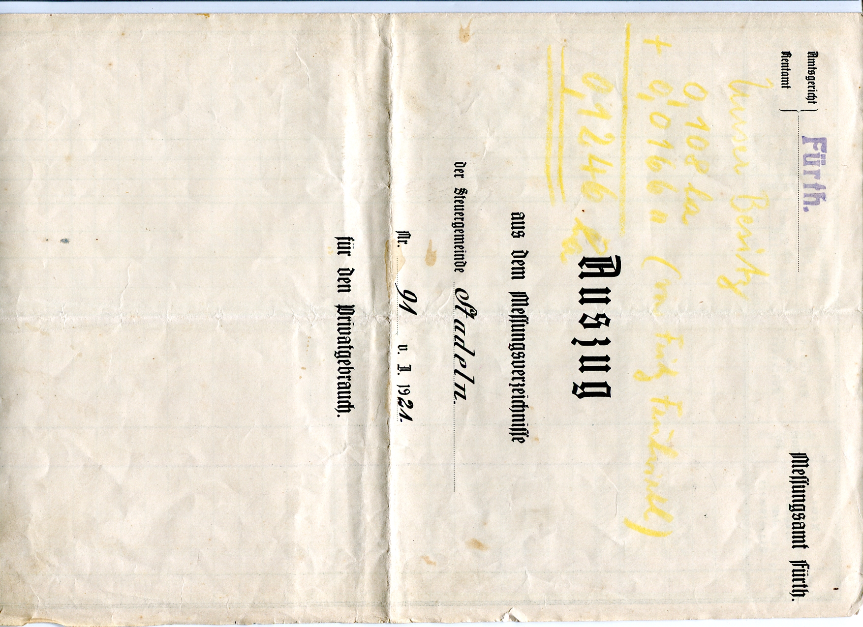 BeschreibungSeite 1 Auszug aus dem "Messungsverzeichnis" des Messungsamt Fürth (jetzige Bezeichnung Vermessungsamt) von 1921 vom Grundstück der Gaststätte Zur Eisenbahn Stadeln der Steuergemeinde Stadeln am Bahnhof Vach