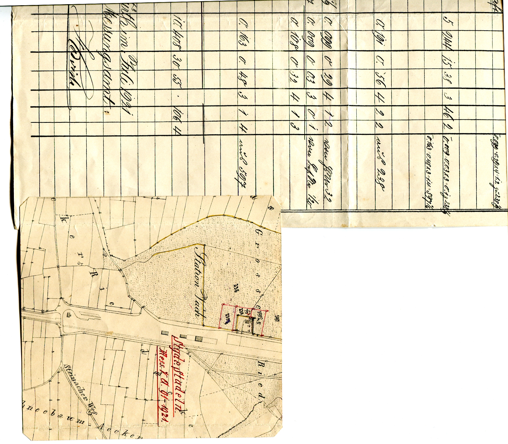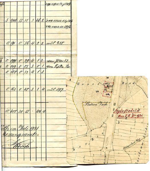 Auszug aus dem "Messungsverzeichnis" des Messungsamtes Fürth (jetzige Bezeichnung Vermessungsamt) von 1921 vom Grundstück der Gaststätte Zur Eisenbahn Stadeln der Steuergemeinde Stadeln mit Lageplan incl. Bahnhof Vach und Gleisanlagen
