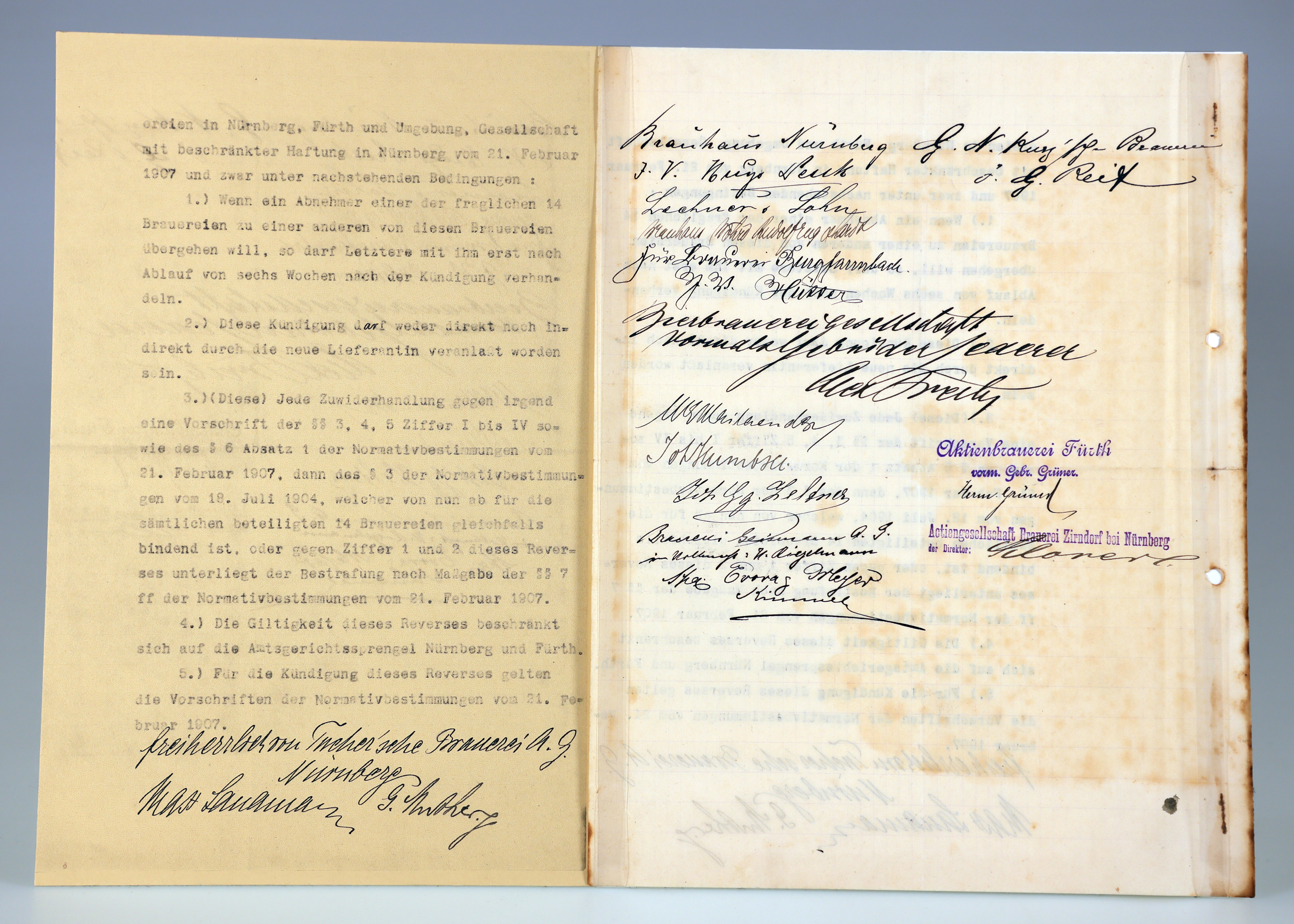 BeschreibungVertragliche Vereinbarung der in Fürth und Nürnberg ansässigen Brauereien über den Wechsel einer Bierabnehmers, Feb. 1907