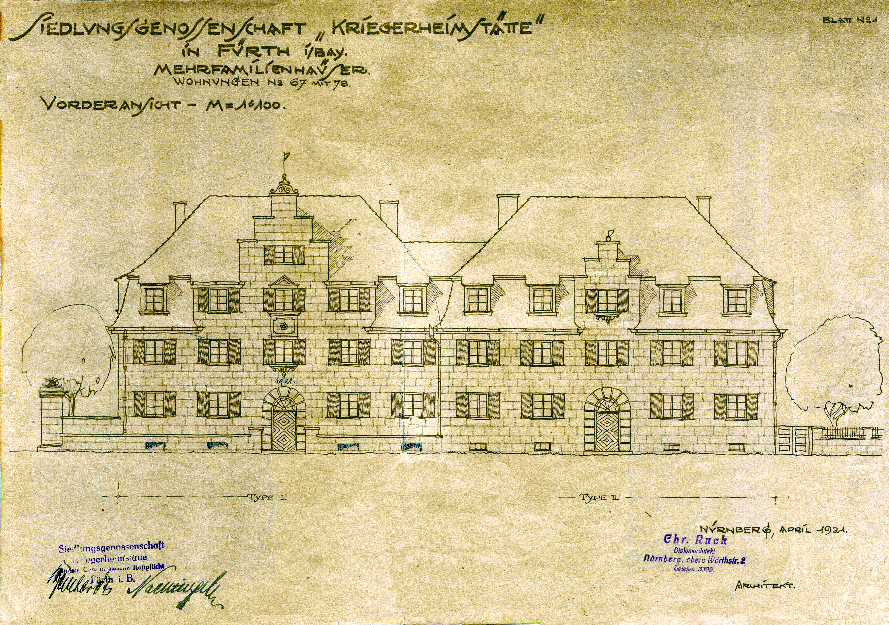 | Dateiinfo (Bild-Unterschrift und Info-Box, automatisch erstellt) | Siedlungsgenossenschaft "Kriegerheimstätte", Vorderansicht Wiesenstraße 41 & 43, Plan 1921 Urheber: Wohnungsgenossenschaft Fürth-Oberasbach eG<br>Erstellungsdatum: 1. April 1921<br>Lizenz: cc-by-sa-3.0 | ||