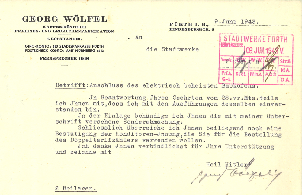 | Beschreibung | historischer Geschäftsbrief der Fa. Georg Wölfel an die Stadtwerke von 1943 | ||