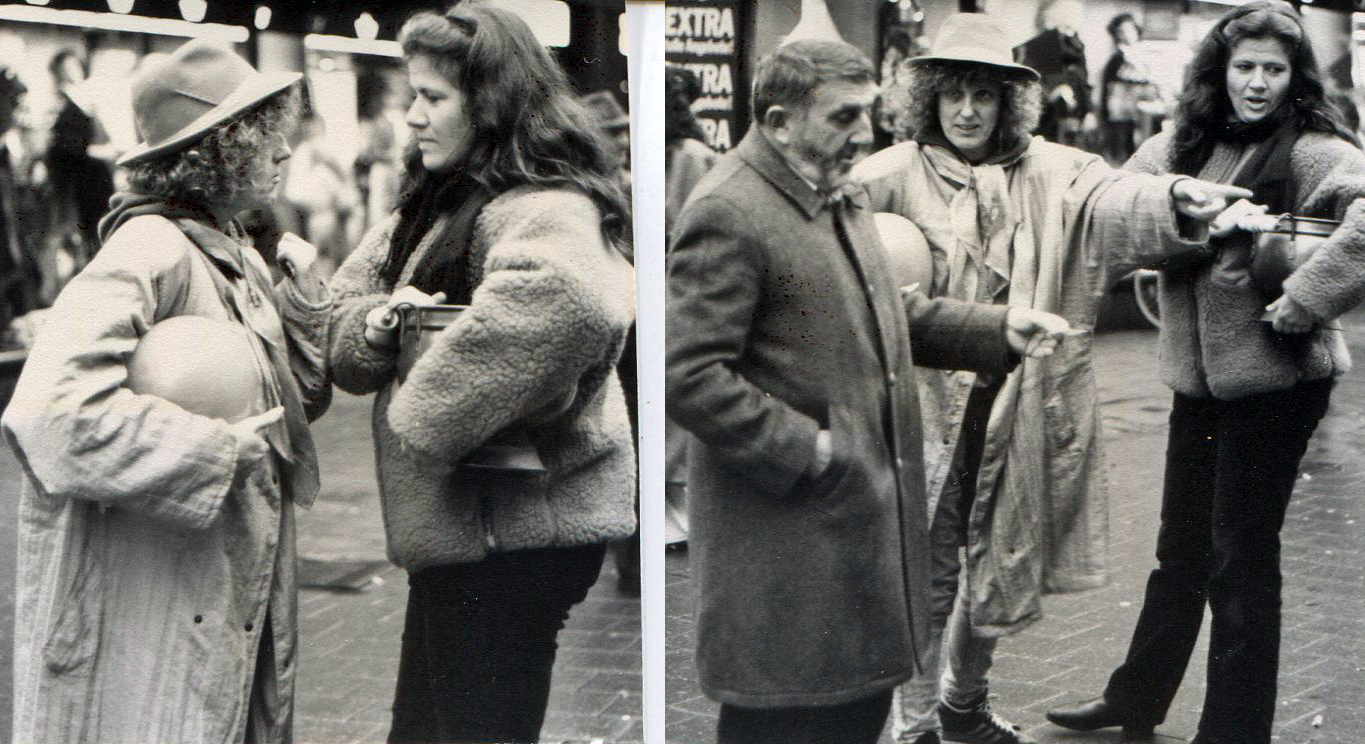 | Beschreibung | Bundestagswahlkampf 1990 der Grünen in der Fußgängerzone mit Dagmar Orwen und Jutta Ditfurth, 1990 | ||