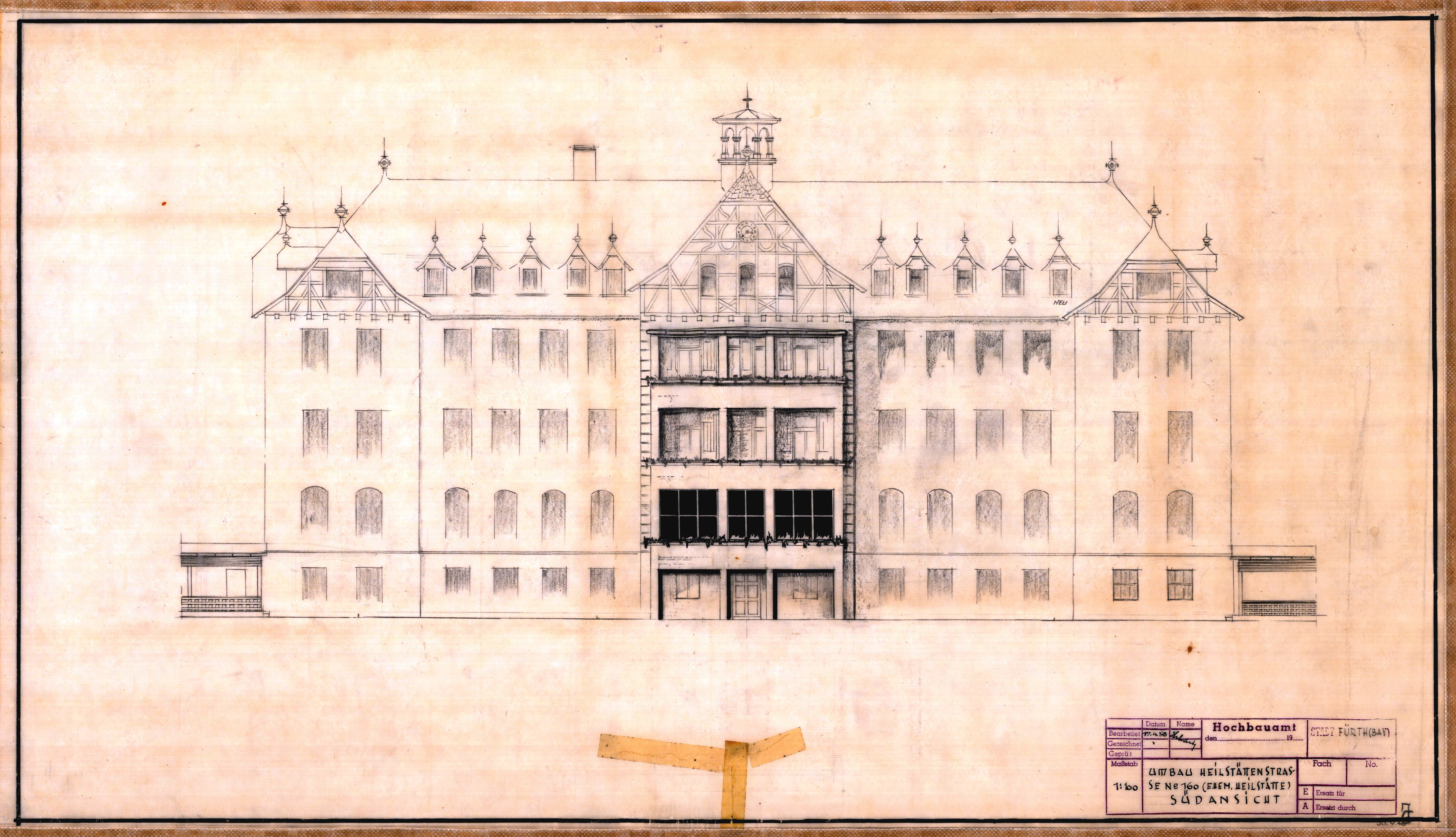 Südansicht des Hauptgebäudes, Umbauplan 1958 Urheber: Stadt Fürth<br>Erstellungsdatum: 1958<br>Lizenz: cc-by-sa-3.0