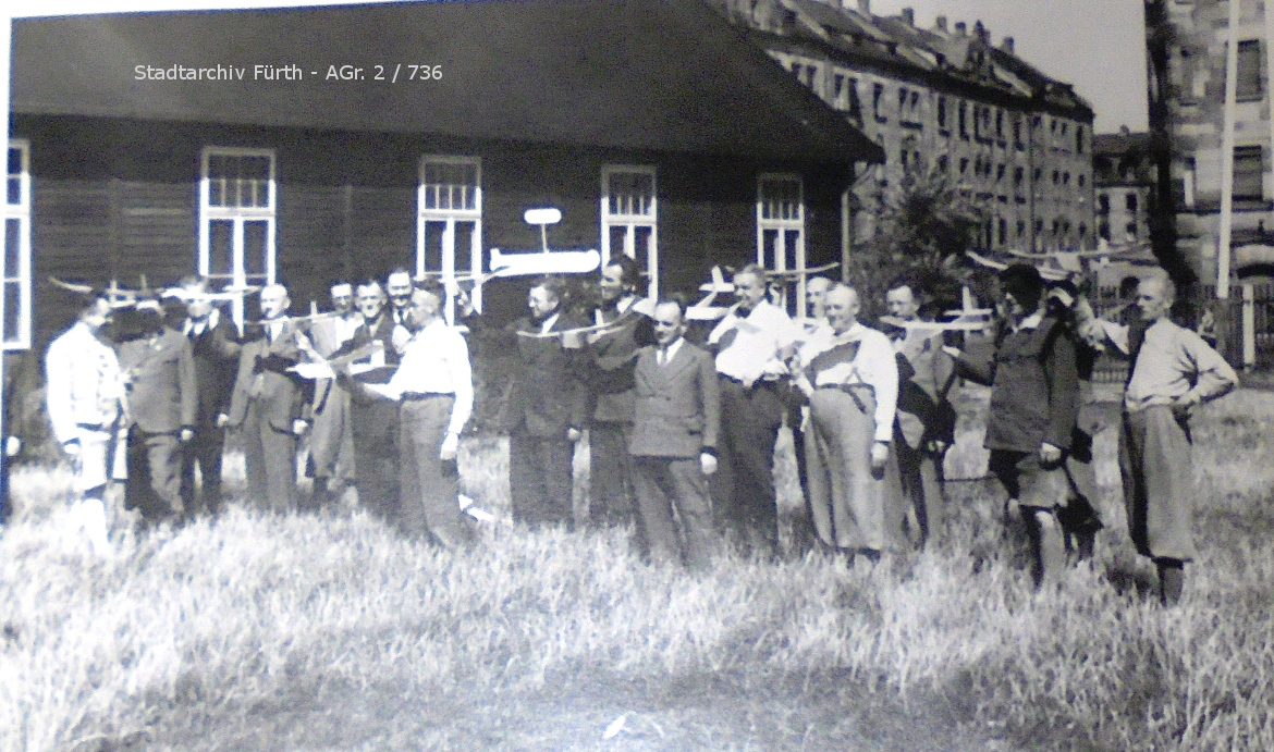 | Dateiinfo (Bild-Unterschrift und Info-Box, automatisch erstellt) | Fürther Lehrergruppe am Ende eines zehntägigen Flugmodellbau-Lehrganges an der NSFK-Baracke in der ... Fürther Lehrergruppe am Ende eines zehntägigen Flugmodellbau-Lehrganges an der NSFK-Baracke in der Waldstr. 34 –<br />im Hintergrund Gebäude Waldstr. 25 und Häuser an der Flößaustr. (August 1941)<br>Urheber: unbekannt / Zeitungsfoto<br>Lizenz: Bildlizenz-Stadtarchiv | ||