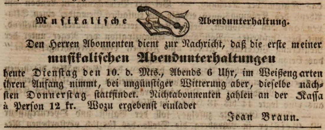 | Dateiinfo (Bild-Unterschrift und Info-Box, automatisch erstellt) | Einladung in den Weißengarten, Juli 1838 Lizenz: noc-nc-1.0 | ||