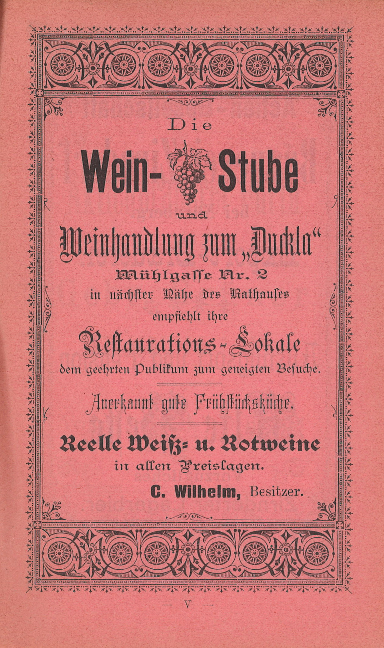 BeschreibungWeinstube Duckla, Mühlstr. 2, Werbeanzeige von 1898