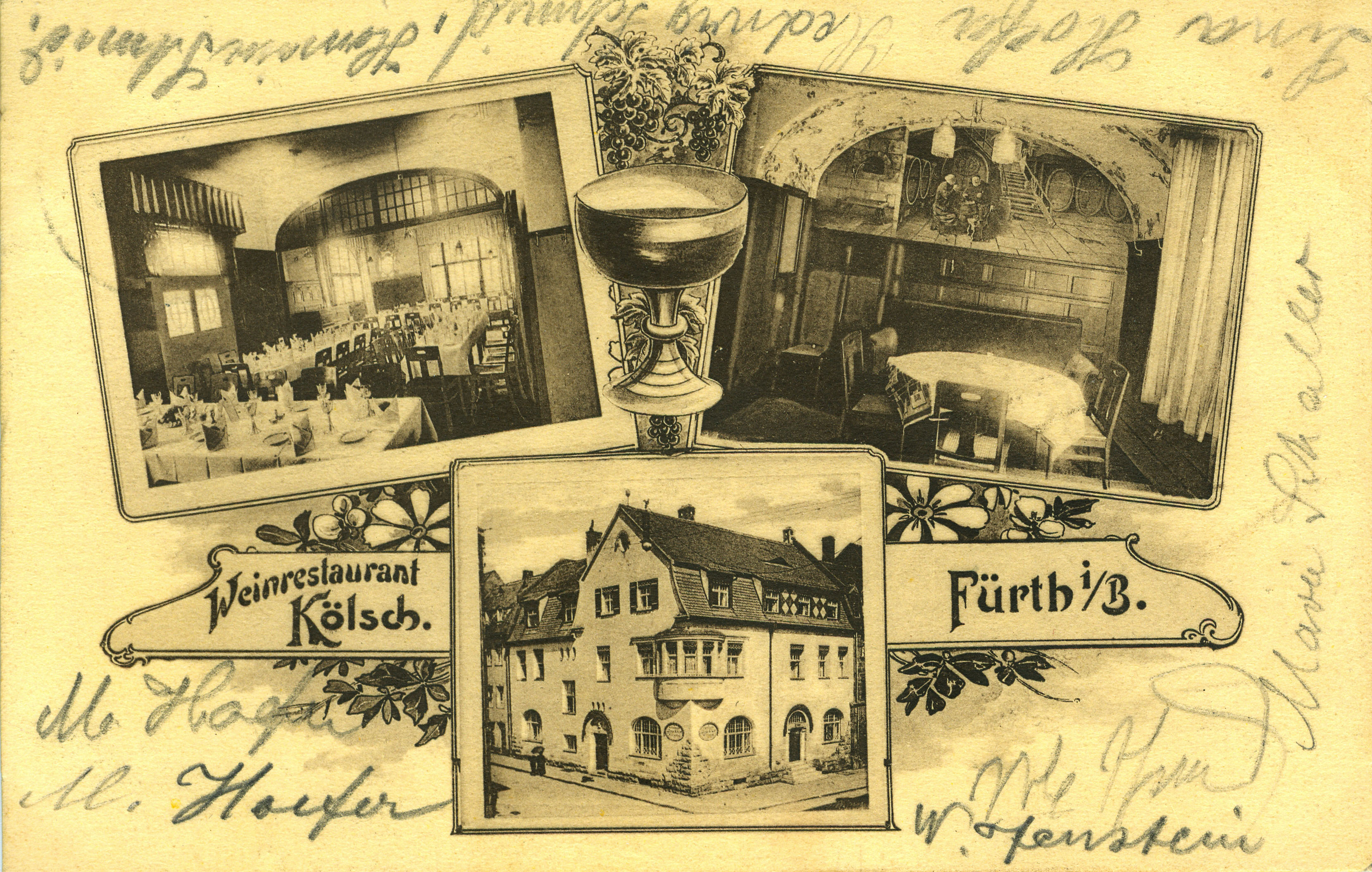 Weinrestaurant Kölsch, Hallstraße, Postkarte gel. 1910 Lizenz: CC BY-SA 3.0 | ||