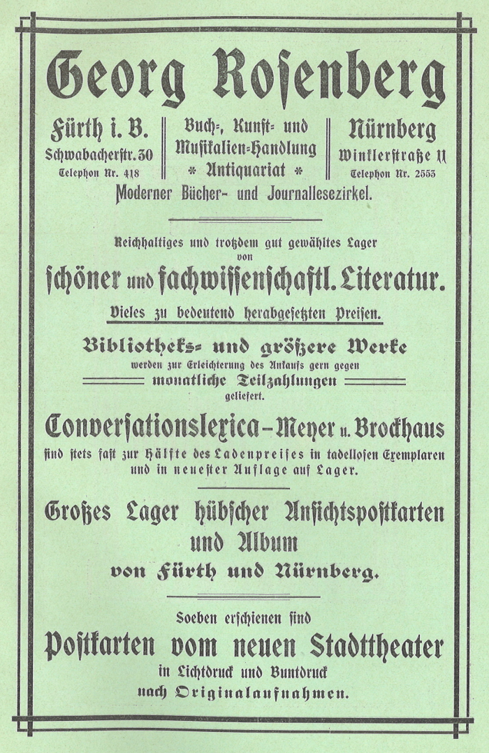 | Dateiinfo (Bild-Unterschrift und Info-Box, automatisch erstellt) | Historische Werbeanzeige der Buchhandlung Rosenberg von 1902 Lizenz: cc-by-sa-3.0 | ||