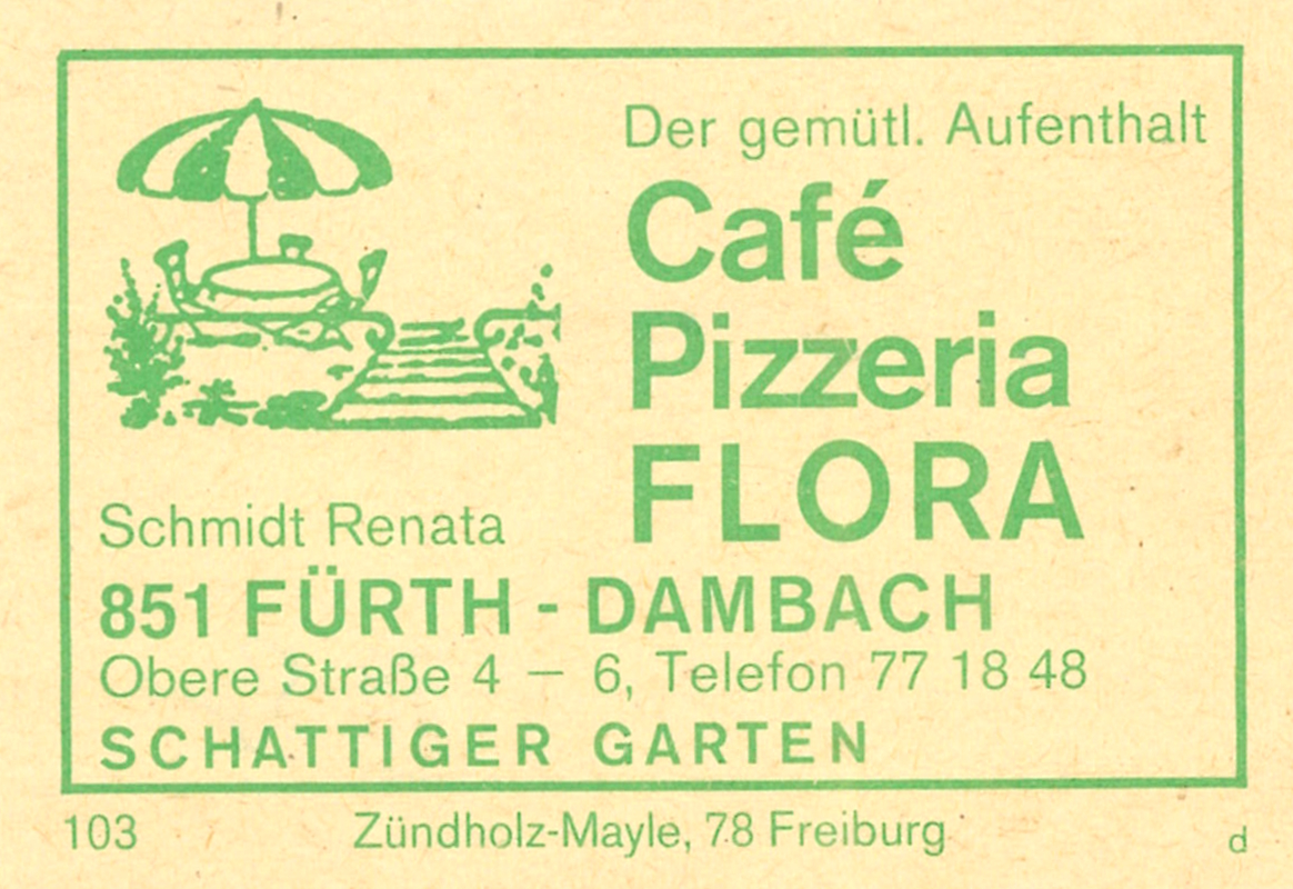 BeschreibungZündholzschachtel-Etikett der ehemaligen Gaststätte Café Flora, um 1965