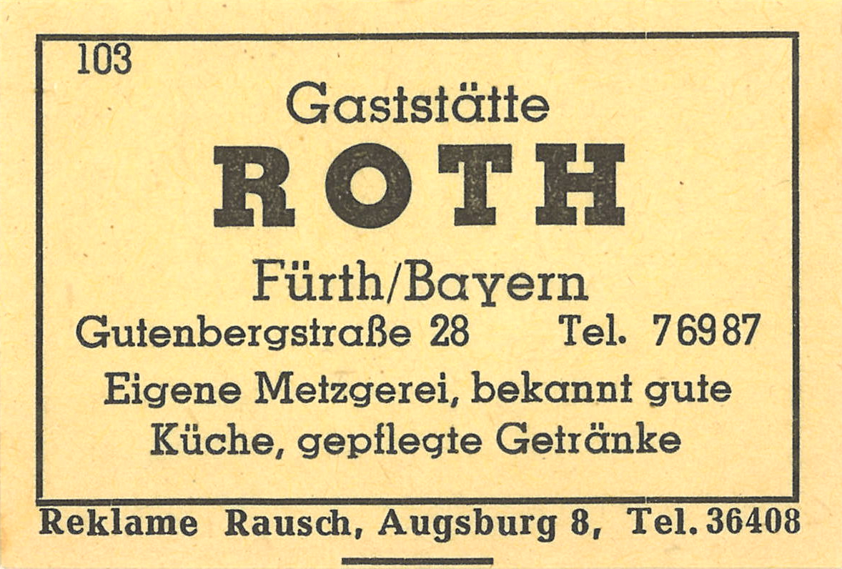 | Beschreibung | Zündholzschachtel-Etikett der ehemaligen Wirtschaft Roth, um 1965 | ||