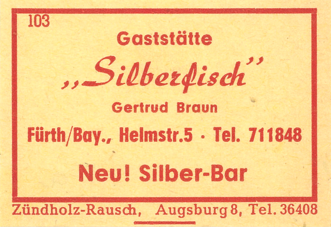 | Beschreibung | Zündholzschachtel-Etikett der Gaststätte zum Silberfischla bzw. Silberfisch, um 1965 | ||