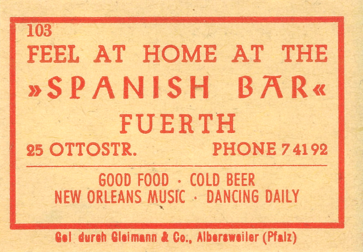 | Beschreibung | Zündholzschachtel-Etikett der ehemaligen Kneipe Spanish Bar, um 1965 | ||