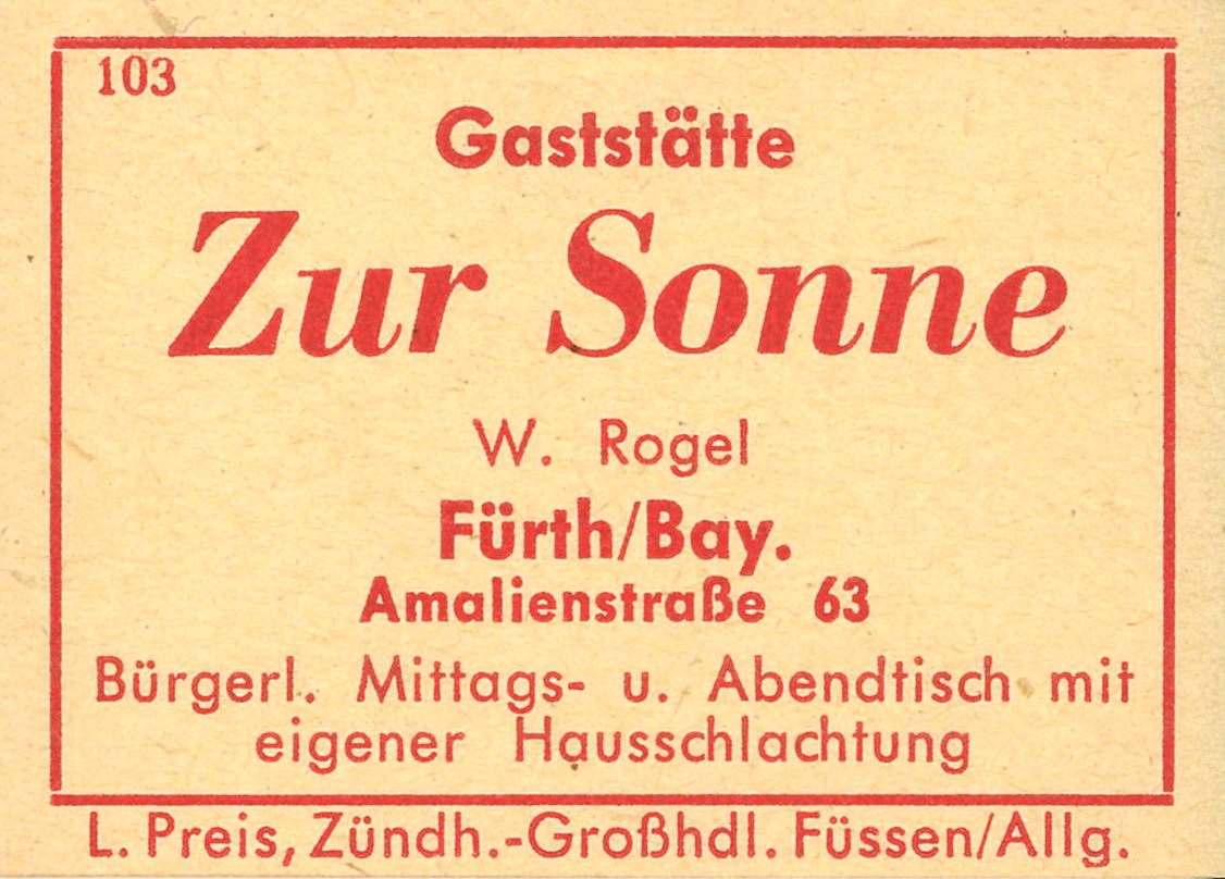 | Beschreibung | Zündholzschachtel-Etikett der ehemaligen Gaststätte Zur Sonne, um 1965 | ||