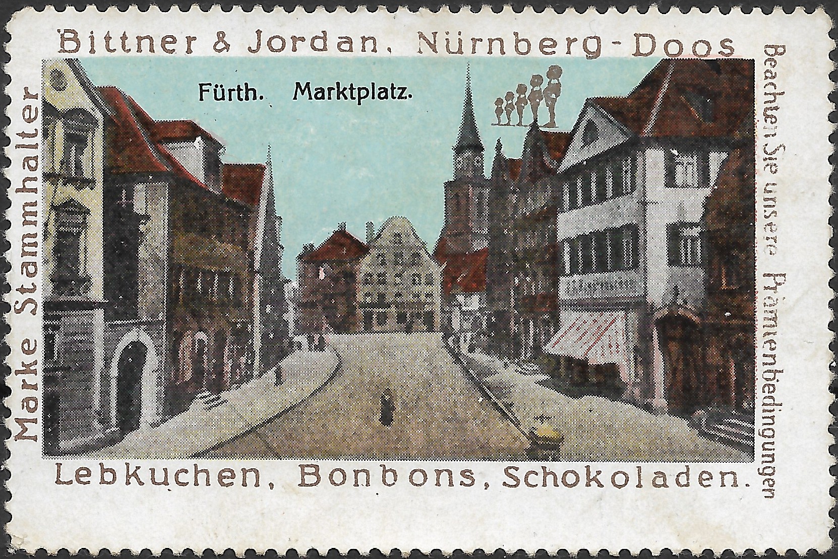 | Beschreibung | Werbemarke "Fürth. Marktplatz." der Firma Bittner & Jordan, Nürnberg-Doos | ||