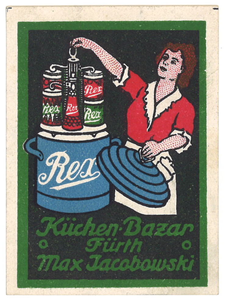 | Dateiinfo (Bild-Unterschrift und Info-Box, automatisch erstellt) | Historische Reklamemarke, Küchen-Bazar Max Jacobowski, um 1910 Lizenz: cc-by-sa-3.0 | ||