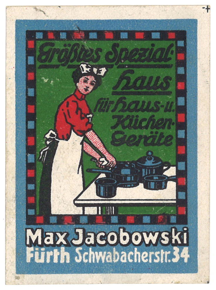 Historische Reklamemarke, Küchen-Bazar Max Jacobowski, um 1910 Lizenz: cc-by-sa-3.0