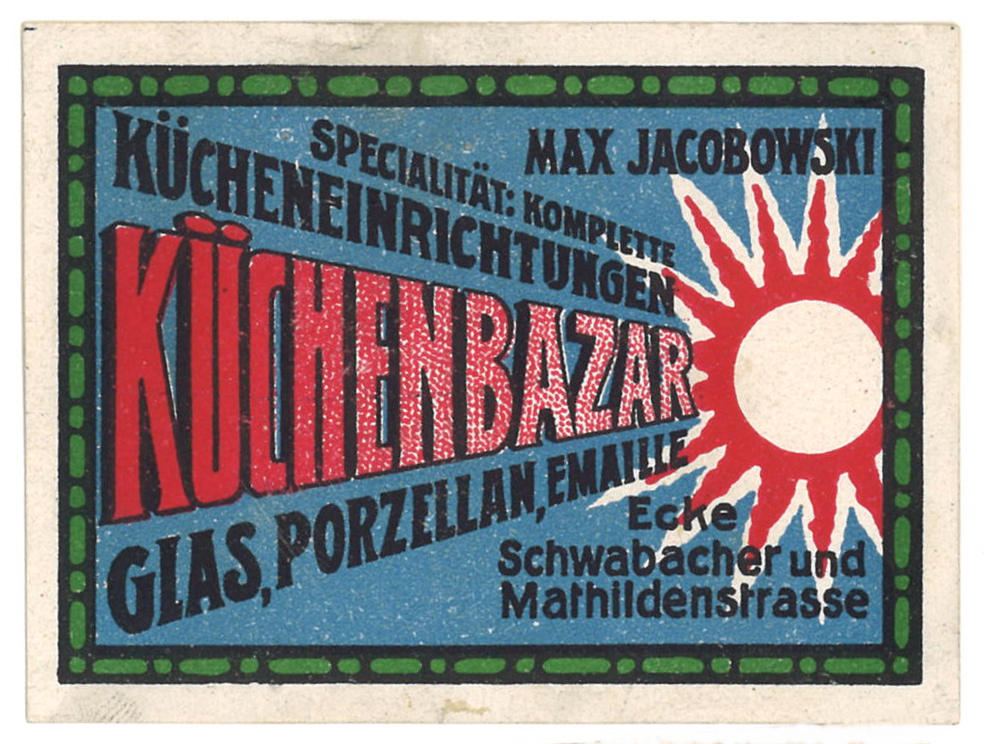 | Dateiinfo (Bild-Unterschrift und Info-Box, automatisch erstellt) | Historische Reklamemarke, Küchen-Bazar Max Jacobowski, um 1910 Lizenz: cc-by-sa-3.0 | ||