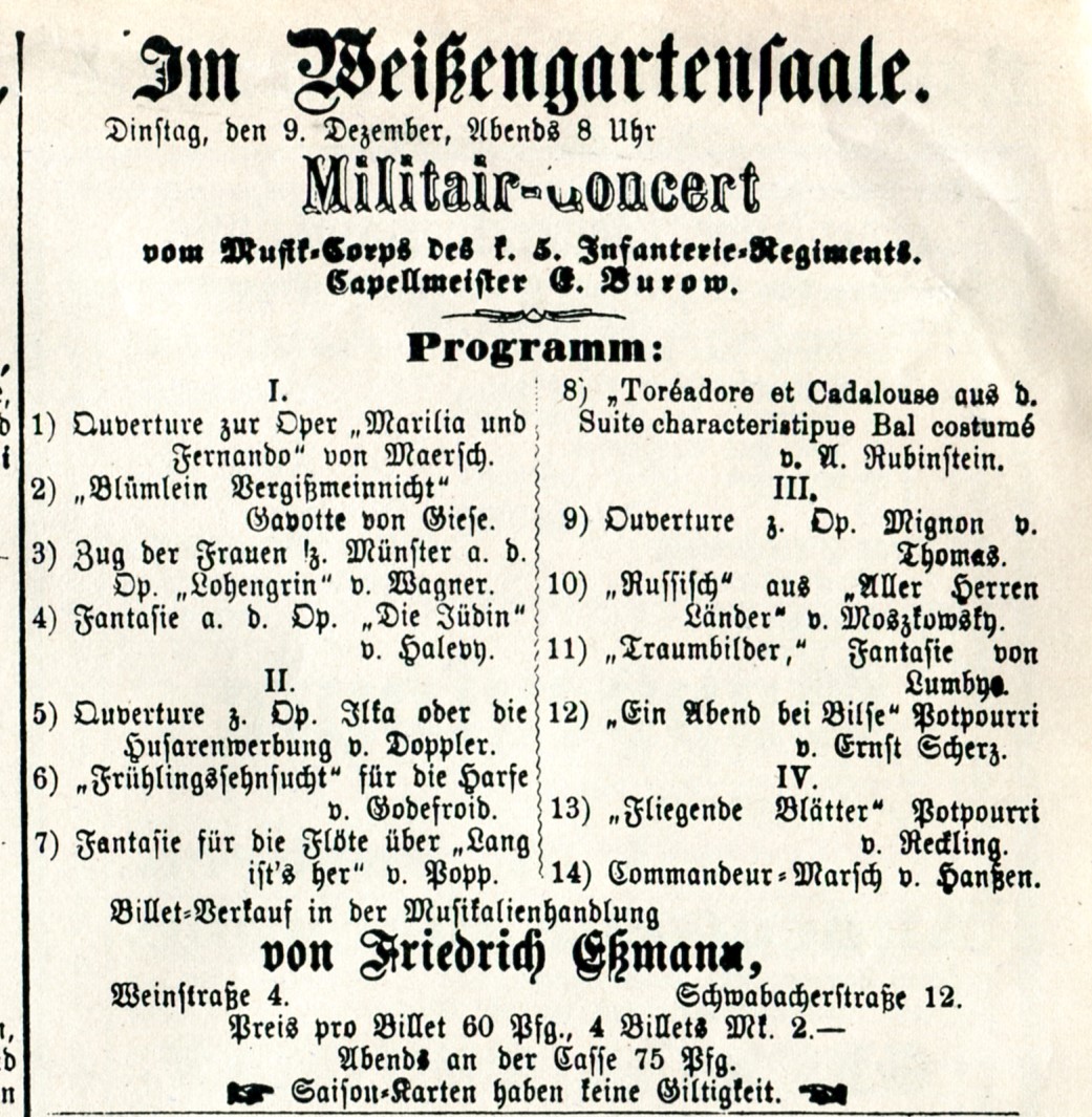 Werbung im Fürther Tagblatt vom 7.12.1884 Militärkonzert des 5. IR im Weißengarten. Komplette Zeitung unter Fürther Tagblatt vorhanden und nachlesbar.