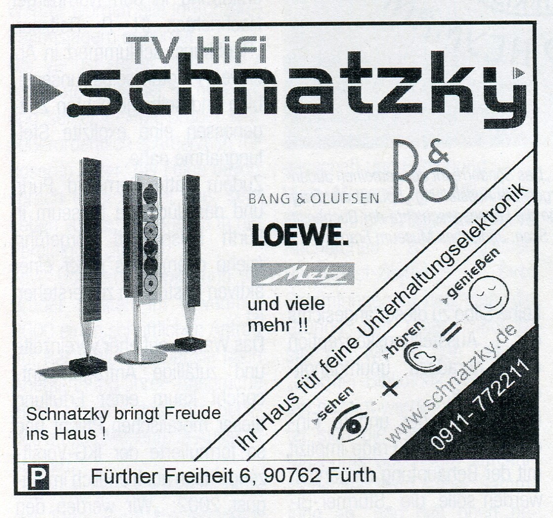 | Dateiinfo (Bild-Unterschrift und Info-Box, automatisch erstellt) | Werbung TV-HiFi-Schnatzky im Dez. 2002 Urheber: Schnatzky<br>Lizenz: cc-by-sa-3.0 | ||