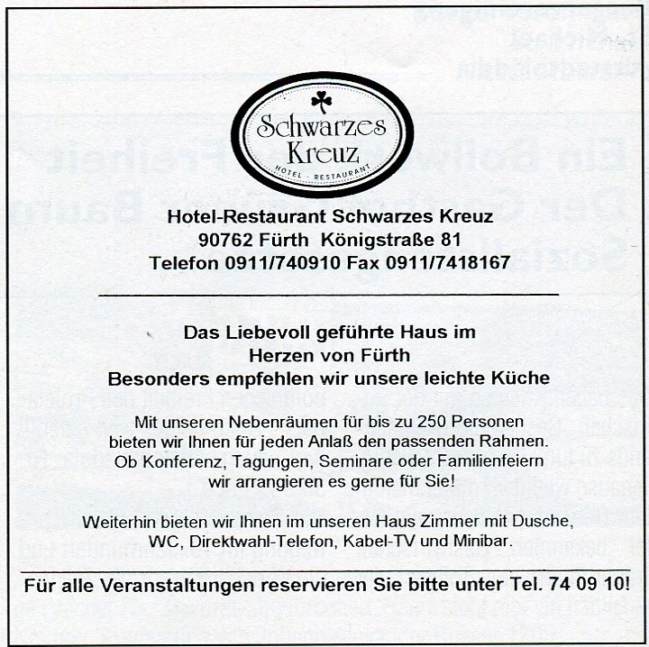 | Beschreibung | Werbung Restaurant Schwarzes Kreuz Dez. 1998 im "Altstadtbläddla" Nr. 33 | ||