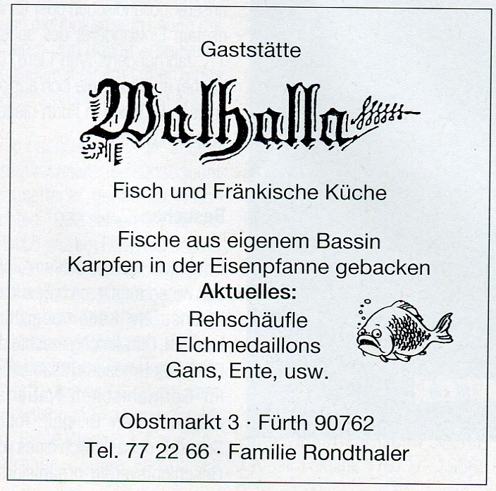 | Beschreibung | Werbung Gaststätte Zur Walhalla 1999 im "Altstadtbläddla" Nr. 34 | ||