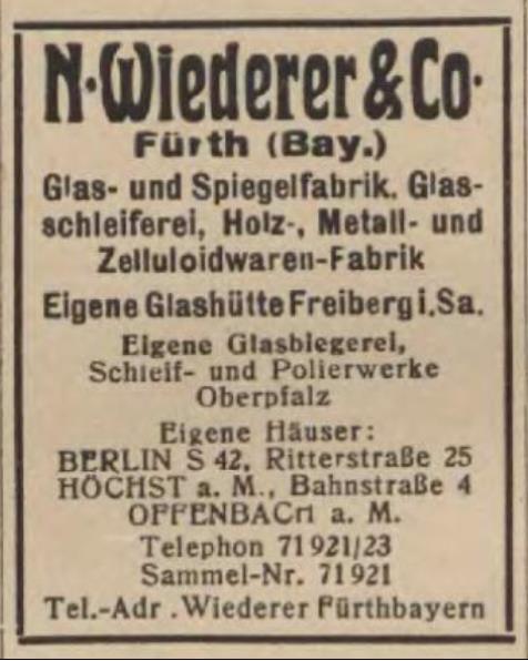 Werbe Eintrag im Fürther Adressbuch 1931 der Glas- und Spiegelfabrik Wiederer & Co.