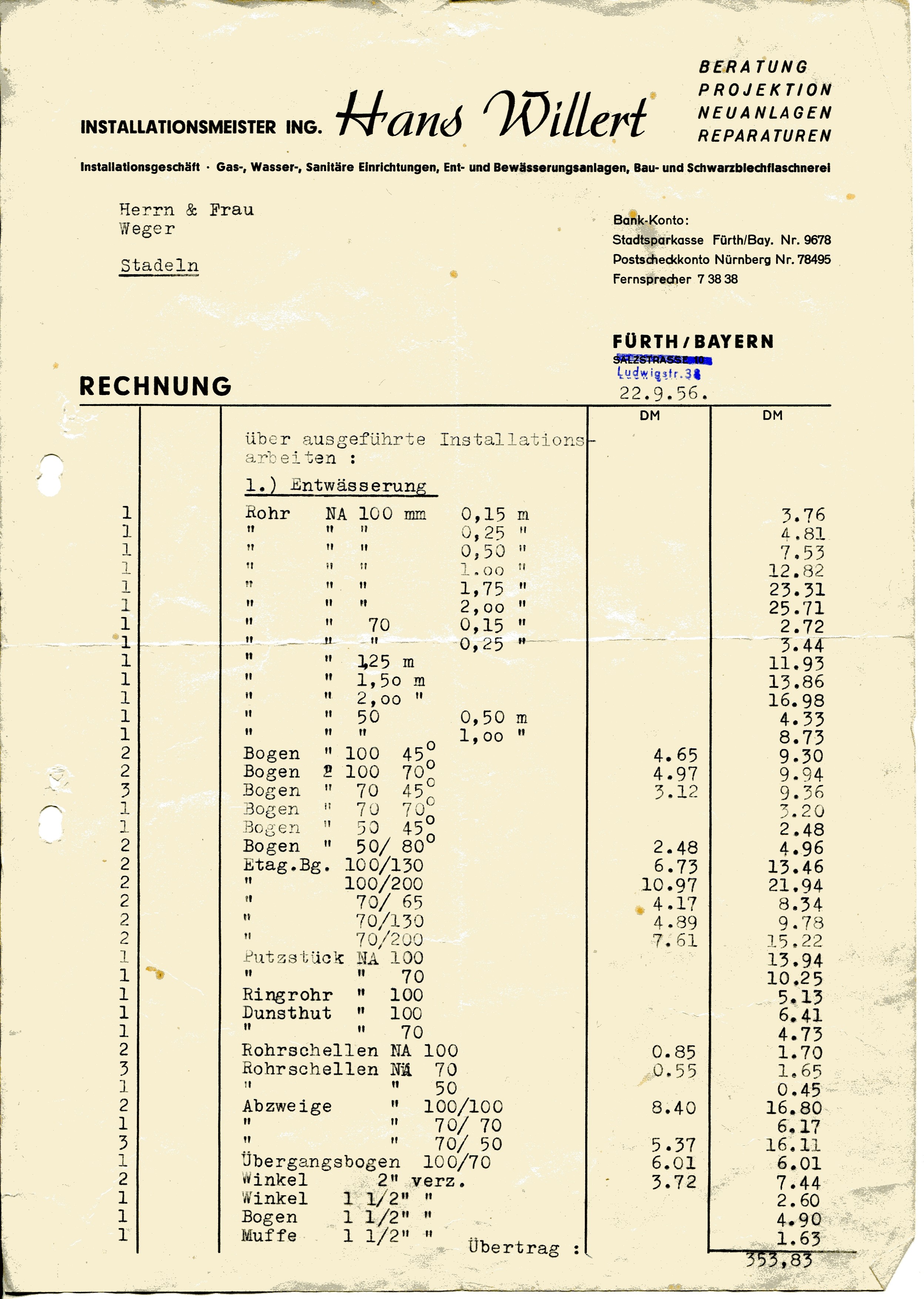BeschreibungRechnung und Briefkopf der Firma Willert von 1956 - die Gesellenstunde für 3,60 DM und der "Stift" für 1,20 DM
