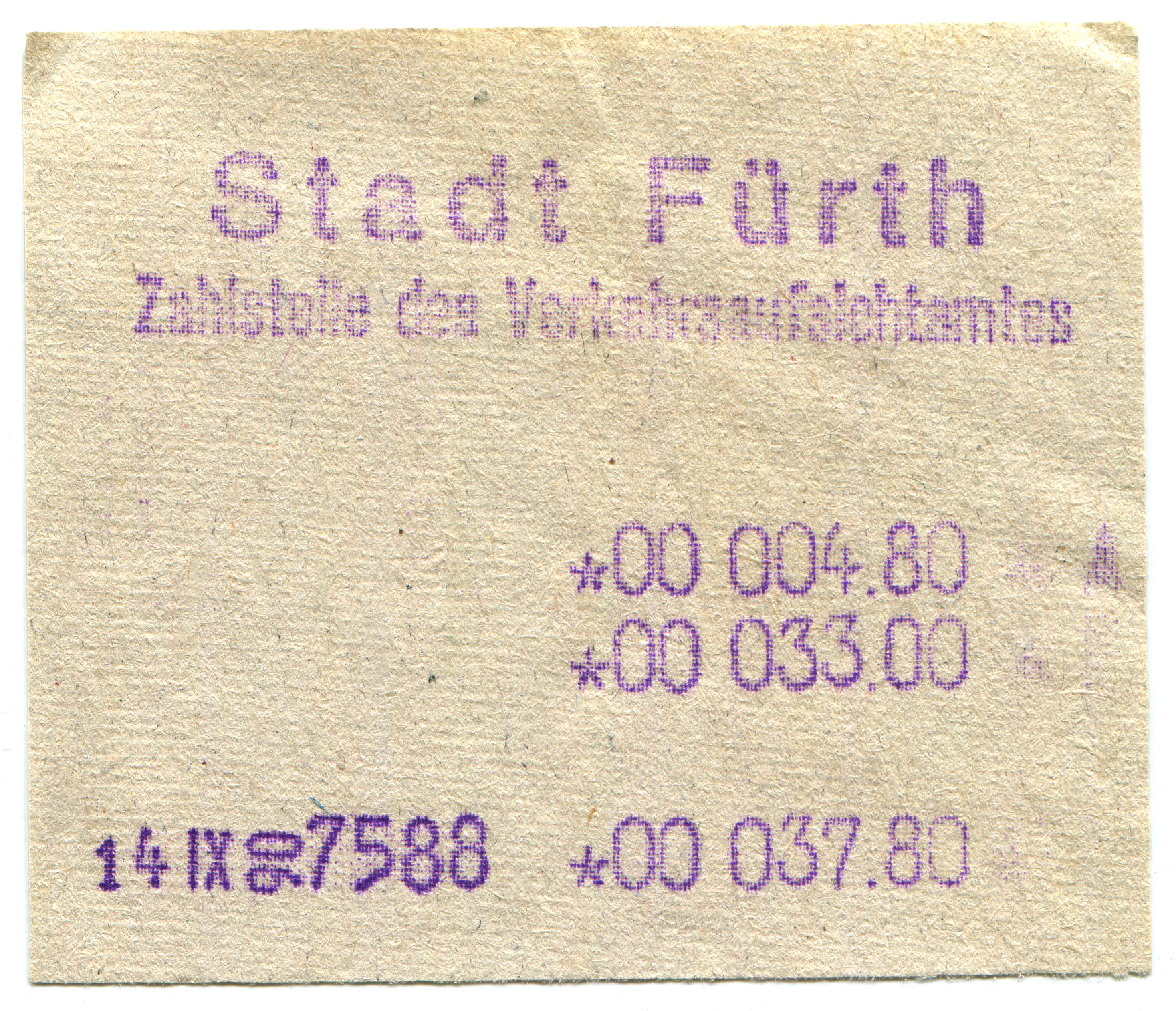 | Dateiinfo (Bild-Unterschrift und Info-Box, automatisch erstellt) | Beleg der Zahlstelle des Verkehrsaufsichtsamtes der Stadt Fürth, 1990 Urheber: Stadt Fürth<br>Erstellungsdatum: 4. September 1990<br>Lizenz: cc-by-sa-3.0 | ||