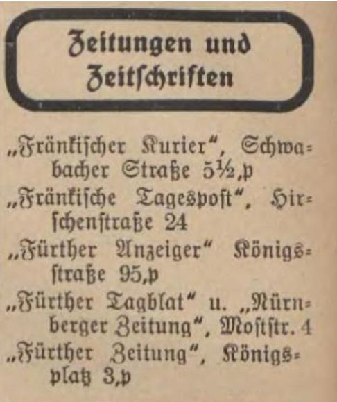 Eintrag im Fürther Adressbuch 1931 aller Fürther Zeitungen.