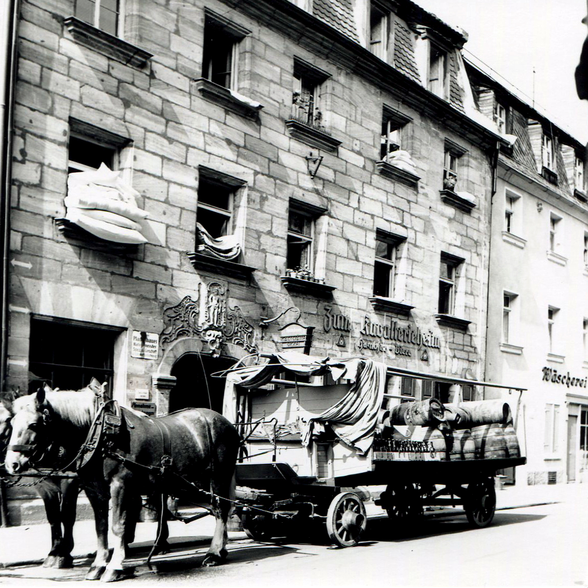 | Beschreibung | Gaststätte Zum Kavallerieheim in der Alexanderstraße, davor Pferdewagen der Brauerei Humbser, ca. 1930 | ||
