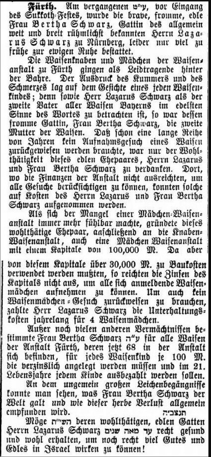 | Beschreibung | Zum Tode der Stifterin der Mädchenwaisenanstalt Fürth: Bertha Schwarz, 1893 | ||