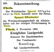 Egmont Offenbacher eröffnete seine Weinhandlung in der Königstraße 104 im Jahr 1882. Später ist sein Geschäft in der Maxstraße 32 (ehemals). Seit 1898 ist er auch als Immobilien- und Hypothekenmakler aktiv.[3]