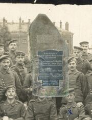 Hab mal den "alten" Gedenkstein mit dem "neuen" überlagert - kommt schon ziemlich genau hin, je nachdem wie die Kamera damals und heute gehalten wurde. Ob das ein Zufall ist? Vielleicht wurde der "gleiche" Gedenkstein öfter aufgestellt? Oder es ist doch ein und derselbe Gedenkstein. Interessant wäre erstmal - erkennt jemand die Gebäude im Hintergrund? Ich habe auch mal in Bayreuth geschaut - die Bauwiese könnte auch "stimmen" - siehe hier Kasernenviertel (Bayreuth). Über der Platte wurde scheinbar auch noch mal etwas ergänzt. Irgendwas mit "Köngl. Bay." und "Ch... Regm.", oder so.-Kasa Fue (Diskussion) 18:36, 27. Okt. 2025 (CET)