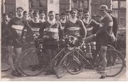 Hier sehen wir eine sehr alte Aufnahme aus dem Hegendörfer-Nachlass, leider unbeschriftet. Somit Aufnahmedatum und abgebildeter Inhalt unklar. Aufgrund der Kleeblätter auf den Trikots könnte es sich evtl. um einen Fürther Fahrradclub handeln. Möglich ist auch, dass sich Georg Hegendörfer auf der Aufnahme befindet, ich konnte ihn jedoch nicht klar identifizieren. Wer kann helfen?