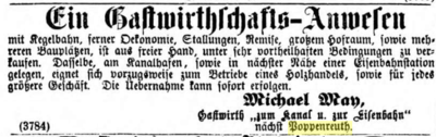 Anzeige für den Gastwirtschaftverkauf "zum Kanal und zur Eisenbahn"