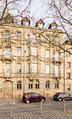 Viergeschossiger traufseitiger Satteldachbau mit reich gegliederter Sandsteinfassade, rustiziertem Erdgeschoss, Gitterbalkonen und polygonalem Mittelerker, Neubarock, von Adam Egerer, 1893, nach Kriegszerstörung unter Erhaltung der Fassade 1957 wiederaufgebaut; Rückgebäude, erdgeschossiger Backsteinbau mit Sandsteinsockel und Pultdach, gleichzeitig.