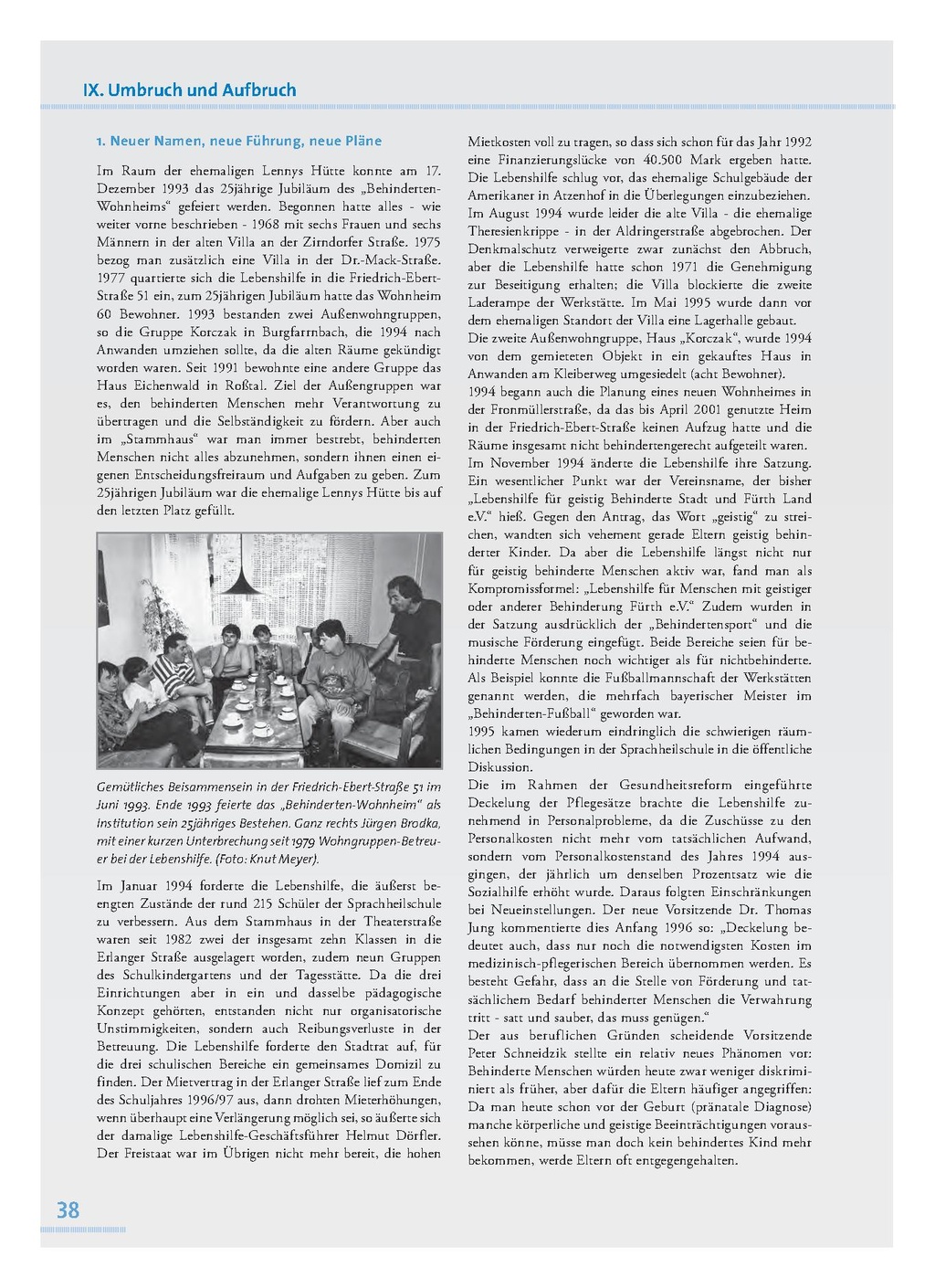 IX. Umbruch und Aufbruch 1. Neuer Namen, neue Führung, neue Pläne Im Raum der ehemaligen Lennys Hütte konnte am 17. Dezember 1993 das 25jährige Jubiläum des „BehindertenWohnheims“ gefeiert werden. Begonnen hatte alles - wie weiter vorne beschrieben - 1968 mit sechs Frauen und sechs Männern in der alten Villa an der Zirndorfer Straße. 1975 bezog man zusätzlich eine Villa in der Dr.-Mack-Straße. 1977 quartierte sich die Lebenshilfe in die Friedrich-EbertStraße 51 ein, zum 25jährigen Jubiläum hatte das Wohnheim 60 Bewohner. 1993 bestanden zwei Außenwohngruppen, so die Gruppe Korczak in Burgfarrnbach, die 1994 nach Anwanden umziehen sollte, da die alten Räume gekündigt worden waren. Seit 1991 bewohnte eine andere Gruppe das Haus Eichenwald in Roßtal. Ziel der Außengruppen war es, den behinderten Menschen mehr Verantwortung zu übertragen und die Selbständigkeit zu fördern. Aber auch im „Stammhaus“ war man immer bestrebt, behinderten Menschen nicht alles abzunehmen, sondern ihnen einen eigenen Entscheidungsfreiraum und Aufgaben zu geben. Zum 25jährigen Jubiläum war die ehemalige Lennys Hütte bis auf den letzten Platz gefüllt.