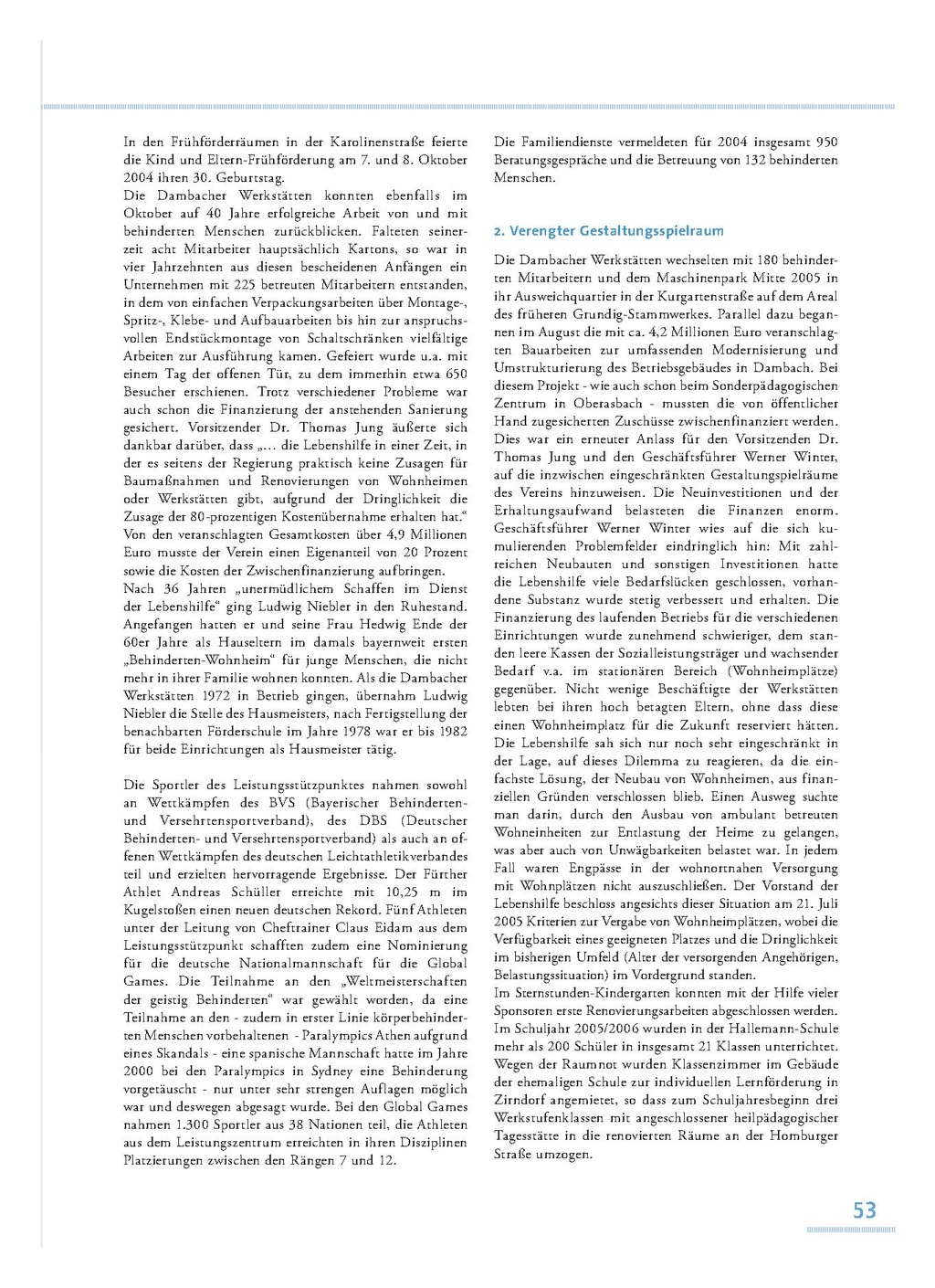 In den Frühförderräumen in der Karolinenstraße feierte die Kind und Eltern-Frühförderung am 7. und 8. Oktober 2004 ihren 30. Geburtstag. Die Dambacher Werkstätten konnten ebenfalls im Oktober auf 40 Jahre erfolgreiche Arbeit von und mit behinderten Menschen zurückblicken. Falteten seinerzeit acht Mitarbeiter hauptsächlich Kartons, so war in vier Jahrzehnten aus diesen bescheidenen Anfängen ein Unternehmen mit 225 betreuten Mitarbeitern entstanden, in dem von einfachen Verpackungsarbeiten über Montage-, Spritz-, Klebe- und Auf bauarbeiten bis hin zur anspruchsvollen Endstückmontage von Schaltschränken vielfältige Arbeiten zur Ausführung kamen. Gefeiert wurde u.a. mit einem Tag der offenen Tür, zu dem immerhin etwa 650 Besucher erschienen. Trotz verschiedener Probleme war auch schon die Finanzierung der anstehenden Sanierung gesichert. Vorsitzender Dr. Thomas Jung äußerte sich dankbar darüber, dass „… die Lebenshilfe in einer Zeit, in der es seitens der Regierung praktisch keine Zusagen für Baumaßnahmen und Renovierungen von Wohnheimen oder Werkstätten gibt, aufgrund der Dringlichkeit die Zusage der 80-prozentigen Kostenübernahme erhalten hat.“ Von den veranschlagten Gesamtkosten über 4,9 Millionen Euro musste der Verein einen Eigenanteil von 20 Prozent sowie die Kosten der Zwischenfinanzierung aufbringen. Nach 36 Jahren „unermüdlichem Schaffen im Dienst der Lebenshilfe“ ging Ludwig Niebler in den Ruhestand. Angefangen hatten er und seine Frau Hedwig Ende der 60er Jahre als Hauseltern im damals bayernweit ersten „Behinderten-Wohnheim“ für junge Menschen, die nicht mehr in ihrer Familie wohnen konnten. Als die Dambacher Werkstätten 1972 in Betrieb gingen, übernahm Ludwig Niebler die Stelle des Hausmeisters, nach Fertigstellung der benachbarten Förderschule im Jahre 1978 war er bis 1982 für beide Einrichtungen als Hausmeister tätig. Die Sportler des Leistungsstützpunktes nahmen sowohl an Wettkämpfen des BVS (Bayerischer Behindertenund Versehrtensportverband), des DBS (Deutscher Behinderten- und Versehrtensportverband) als auch an offenen Wettkämpfen des deutschen Leichtathletikverbandes teil und erzielten hervorragende Ergebnisse. Der Fürther Athlet Andreas Schüller erreichte mit 10,25 m im Kugelstoßen einen neuen deutschen Rekord. Fünf Athleten unter der Leitung von Cheftrainer Claus Eidam aus dem Leistungsstützpunkt schafften zudem eine Nominierung für die deutsche Nationalmannschaft für die Global Games. Die Teilnahme an den „Weltmeisterschaften der geistig Behinderten“ war gewählt worden, da eine Teilnahme an den - zudem in erster Linie körperbehinderten Menschen vorbehaltenen - Paralympics Athen aufgrund eines Skandals - eine spanische Mannschaft hatte im Jahre 2000 bei den Paralympics in Sydney eine Behinderung vorgetäuscht - nur unter sehr strengen Auflagen möglich war und deswegen abgesagt wurde. Bei den Global Games nahmen 1.300 Sportler aus 38 Nationen teil, die Athleten aus dem Leistungszentrum erreichten in ihren Disziplinen Platzierungen zwischen den Rängen 7 und 12.