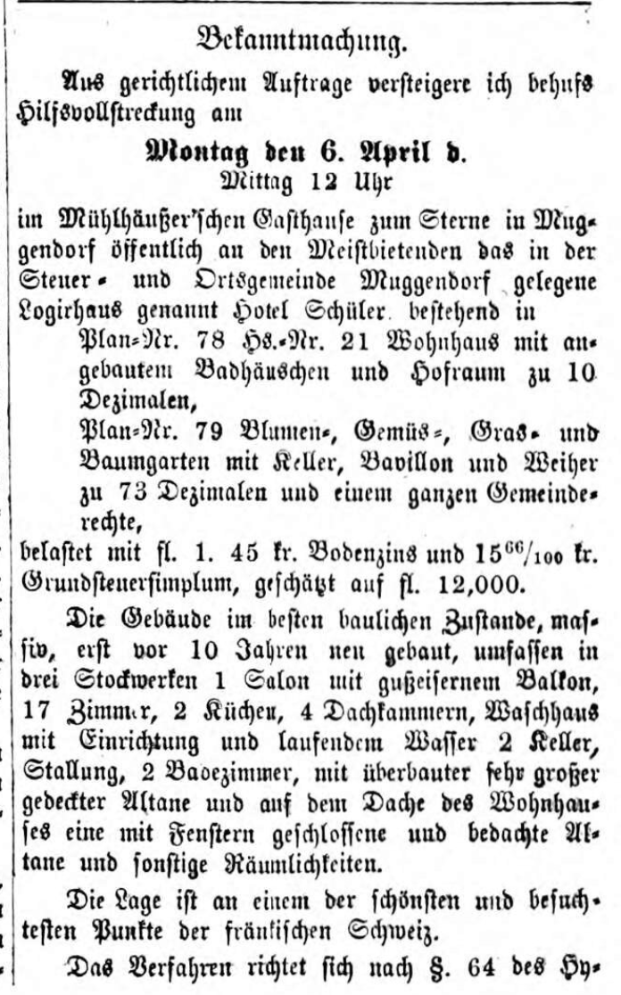 | 18:26, 16. Okt. 2025 | 1868-04-16 Fränk.Kurier Versteigerung.png (Datei) | 381 KB | {{Bild}}Versteigerung Hotel Schüler in Muggendorf, April 1868 | 1 | |